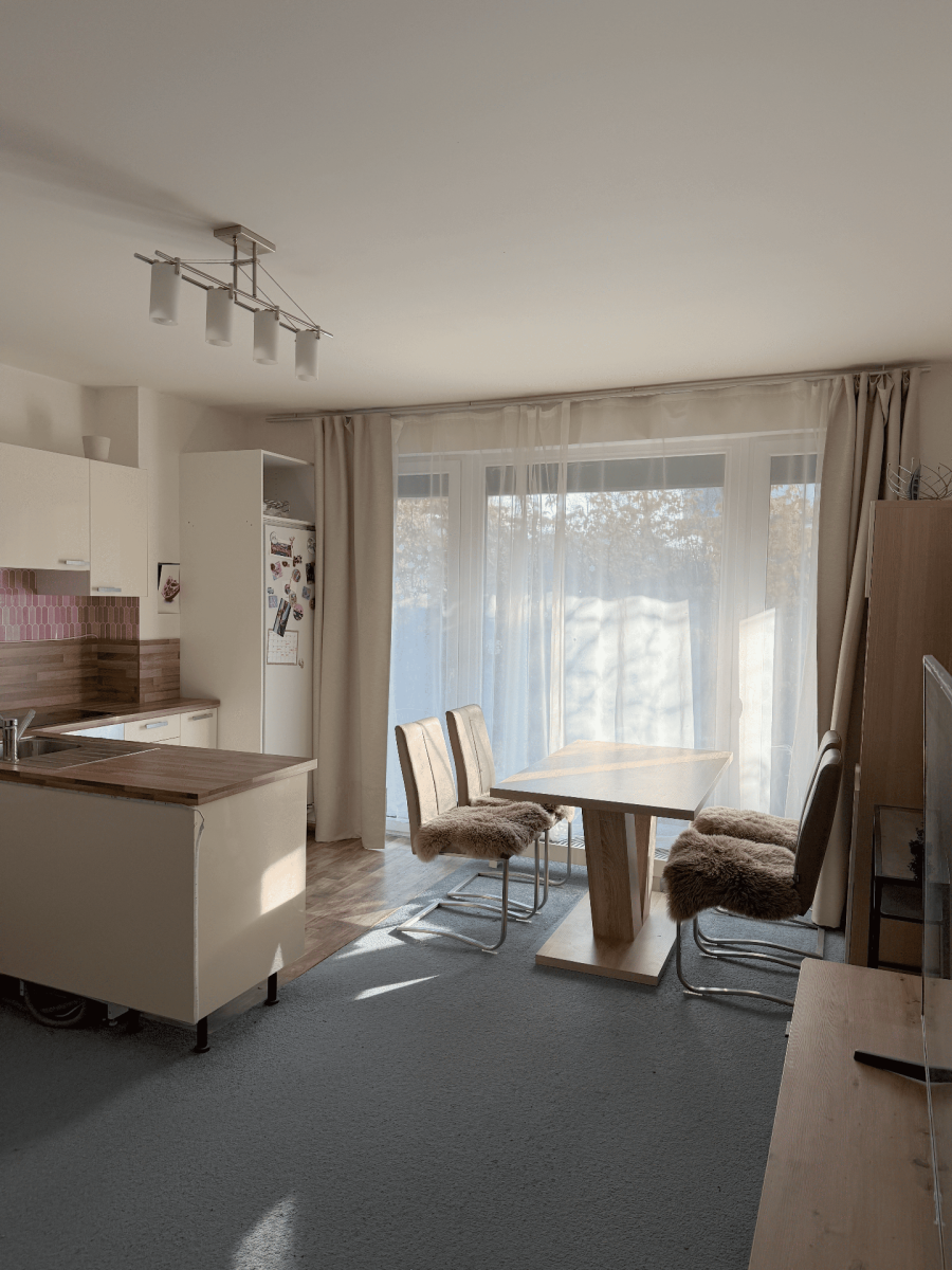 Светлая 3+kk квартира с террасой в новостройке на 1 этаже. Полностью меблирована, с большим телевизором, стиральной машиной, посудомоечной машиной и принтером. Спальня, гостиная с кухней, отдельный кабинет/детская. Отдельная ванная и туалет. Панорамные окна на 143 м² террасу. Рядом детские площадки, велодорожки, лесопарк. Автобусная остановка в 2 минутах. Парковочное место в подземном гараже.